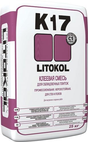 Качественный результат при отделке стен и потолков плиткой и мозаикой из мраморной крошки и керамики можно получить, если использовать специальные клеи. Литокол К 17 — клеевая смесь, созданная для фасадных работ и оформления интерьера, обеспечивая высокую адгезию (не менее 0,5 Н/мм2) вне зависимости от влажности среды. Основной компонент смеси — цемент, обеспечивающий раствору прочность и надёжное соединение с основанием.