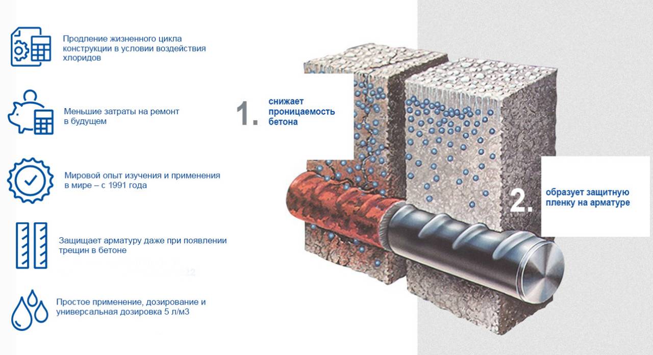 MasterLife CI 222 работает по двум направлениям – замедляет коррозию и снижает проницаемость бетона, что делает этот продукт самым эффективным ингибитором среди существующих.